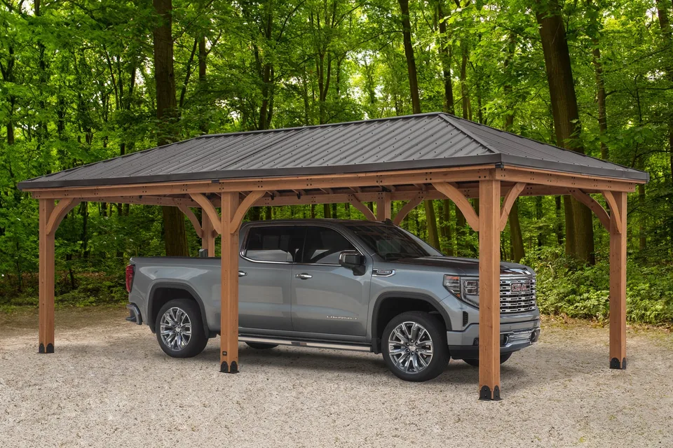 Carports protect vehicles from sun and weather without the cost of a full garage. We handle single- and double-vehicle carports in wood, steel, and aluminum — with concrete footings, proper anchoring, and optional electrical for EV charging, lighting, or outdoor outlets.
